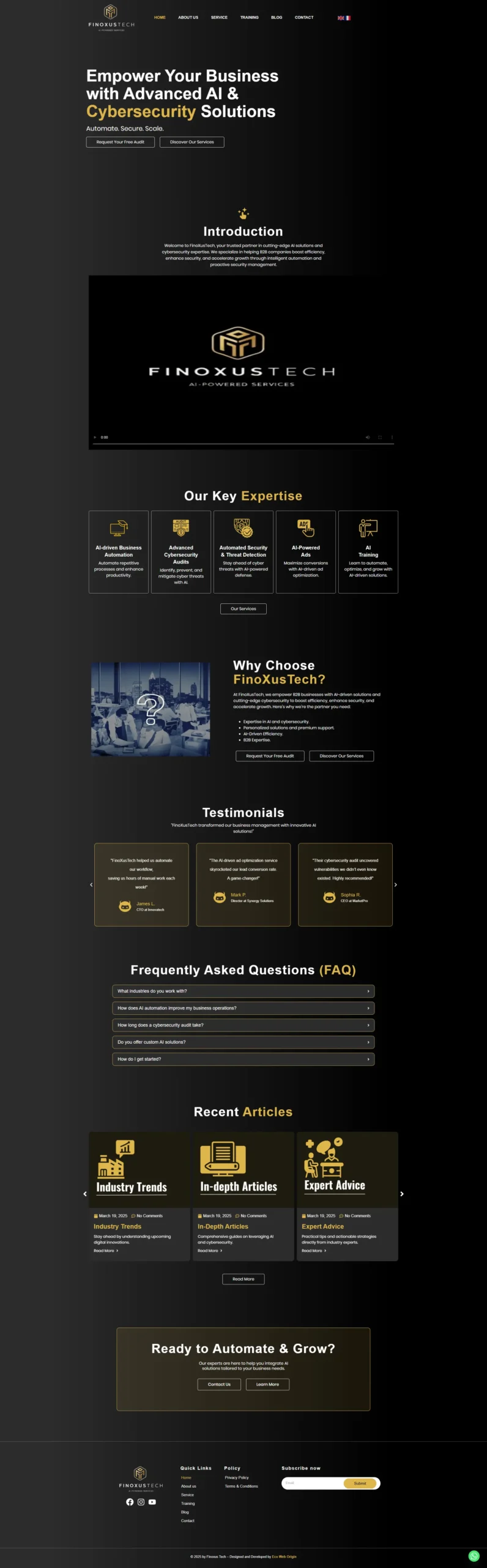 Finoxustech wanted a simple, easy-to-manage website that clearly showcases their AI and cybersecurity services, with the added need for multi-language support to reach a broader audience.We developed a clean, multi-page website focused on simplicity and ease of use. The design ensures visitors can quickly find the information they need, while the client can effortlessly update content. To support their diverse audience, we integrated multi-language functionality, allowing the website to be easily switched between different languages.The project was completed within 20 days, delivering a fully responsive, user-friendly site that works seamlessly on all devices. The content management system was set up to let the client manage all languages smoothly without technical difficulties.The client was very happy with the result—a professional, functional, and multilingual website that helps them connect with a wider audience and maintain their digital presence with ease.